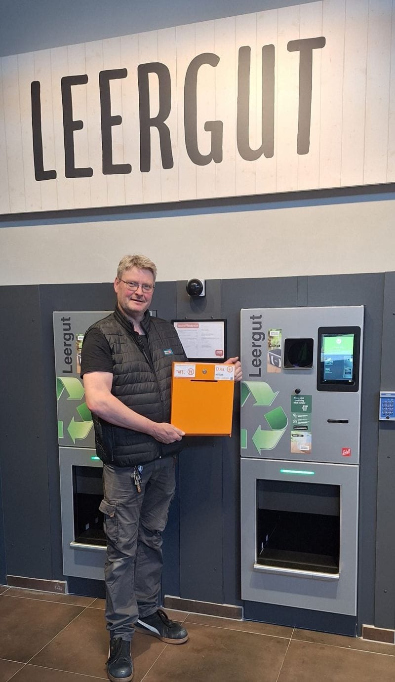 Hr. Assmann persönlich nahm den neuen Pfand-Bon Briefkasten in Empfang, in den ab sofort die Kund:innen des REWE Leun ihre Pfandbons spenden können. Auch so