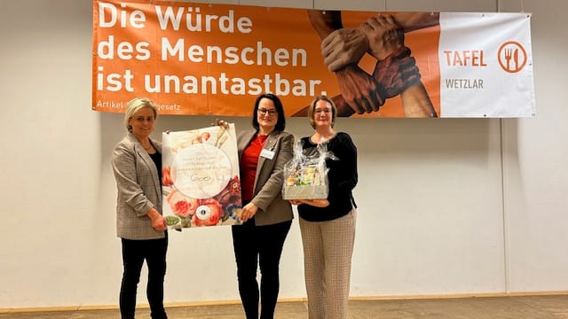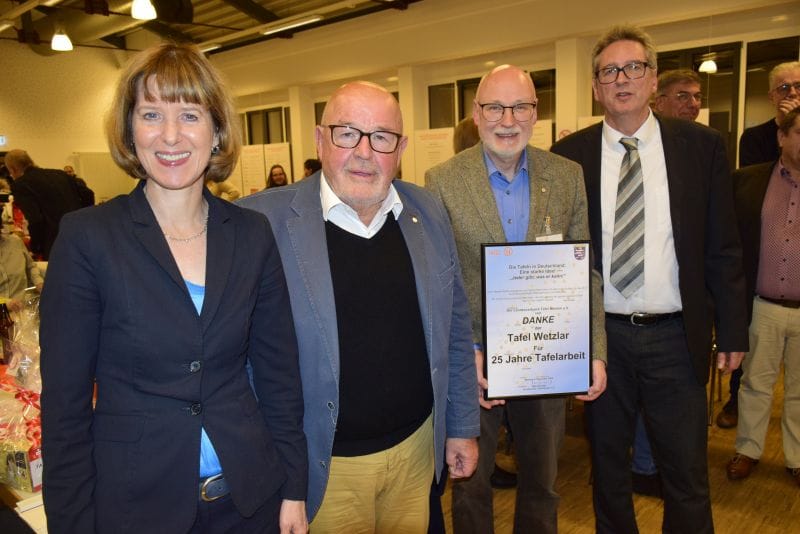 Grußworte von Staatsministerin Hofmann (Ministerium für Arbeit, Integration, Jugend und Soziales), Oberbürgermeister Wagner (Stadt Wetzlar), Vorstandsvoritzender der Sparksse Wetzlar Stephan Hofmann (für alle Spender:innen), Erich Linder (Tafel Deutschland/Tafel Hessen) und Christoph Schaaf (Kirchenkreis an Lahn und Dill) drückten den DANK für 25 Jahre engagierte Arbeit alle Menschen in der Tafel Wetzlar aus. Diese wichtige und hilfreiche Arbeit war und ist auch die Motivation der zum Teil langjährigen Unterstützer:innen. Die Mitarbeitenden erhielten für ihre Engagement „Standing ovations“.
