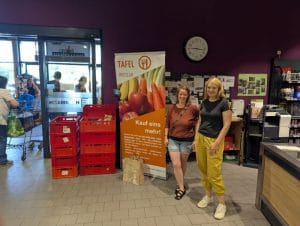 „Kauf eins mehr“ heißt die Aktion, die derzeit die knappen Lebensmittelspenden ergänzt. Ein Gruppe steht vor einem Supermarkt und bittet die Kund:innen ein Teil mehr (Blumenkohl, Karotten, Tomaten, Nekatrinen, …) für die Tafelkund:innen zu kuafen.