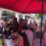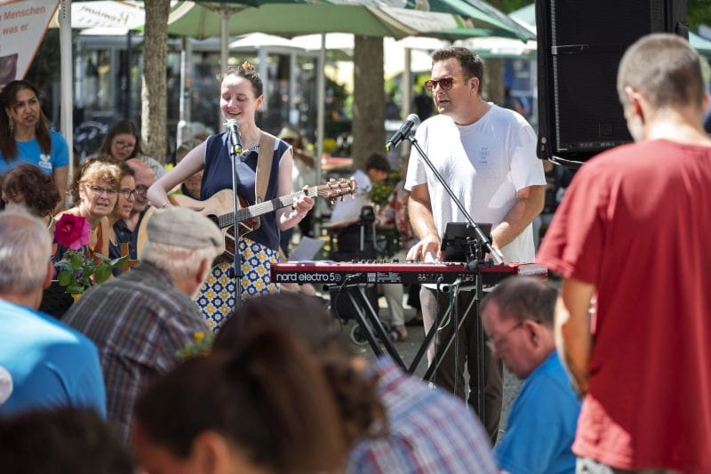 zum 10. Mal seit 2013 fand die Wetzlarer lange Tafel am Samstag, 28. Juni bei strahlendem Wetter in der Bahnhofstraße statt. Schon zum Gottesdienst um 11.30 h ließen sich viele Menschen einladen zum sitzen, zuhören, mitsingen und beten. Kleine Interviews mit Oberbüergermeister Wagner, der der Schirmherr der Langen Tafel von Anbeginn ist, mit Daikon Christof Mayer, dem Leiter der Tafel und Stefanie Stais, der stellvertretenden Leitung der VHS überbrückten die Zeit bis zum leckern Mittagessen. Für nur 1 € (gesponsort von der Bäckerei Moos und Flüchtlingsgruppen) konnten die Gäste sich stärkten. Die VHS bot einen kleine Workshop zum „upcycling“ an, vor der Stadtbibliothek war eine Leselounge aufgebaut und bei fetziger Musik konnte nach dem Essen eine Runde Zumba getanzt weden.