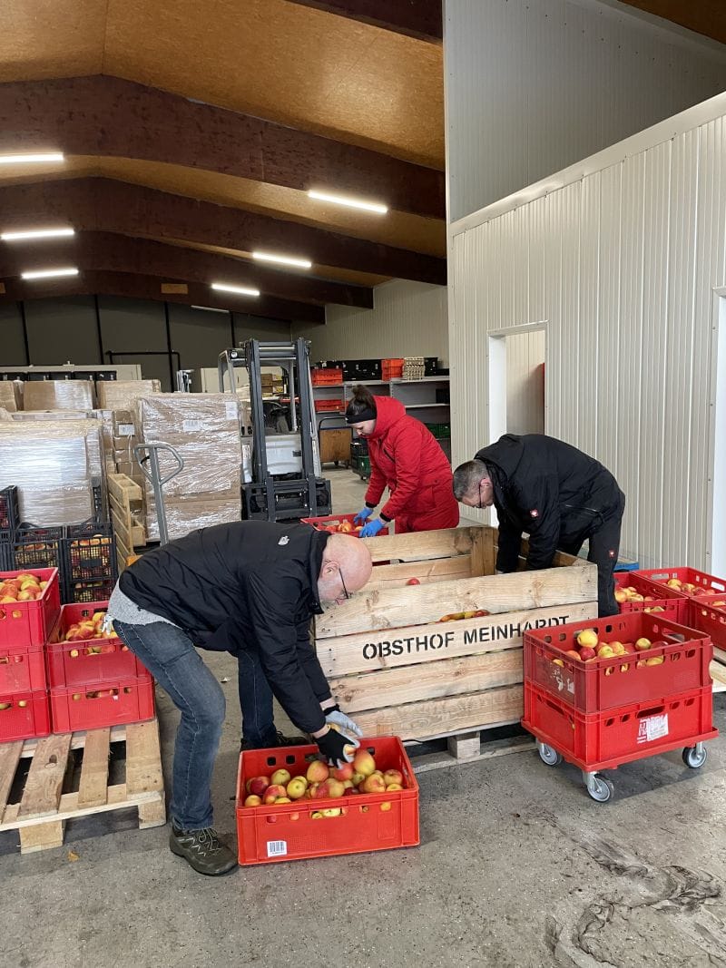 22 Hände halfen dann die Äpfel aus den großen Holzkisten in Lebensmittelkisten der Tafel Wetzlar umzupacken. Bei so vielen Händen macht die Arbeit Spaß. Vor allem wird die Freude bei den Kund:innen der Tafel Wetzlar groß sein, wenn sie in der nächsten Woche leckere Äpfel im Korb haben werden. Rechnerisch bekommt jeder Haushalt 1,7 kg Äpfel. Beim derzeitigen Ladenpreis von ca. 3,99 € Obst im Wer von 6,95 €.